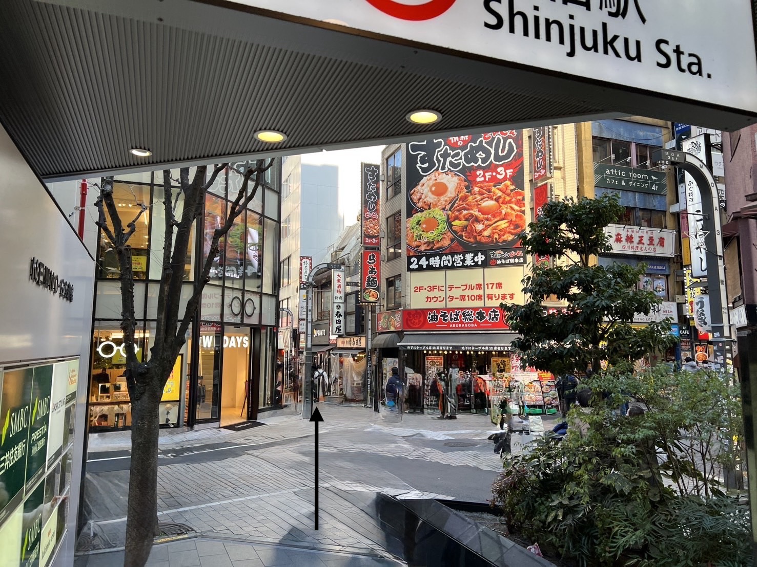 東口を直進していただきますと登り階段と下り階段が出てきますが、下り階段で降りてください。